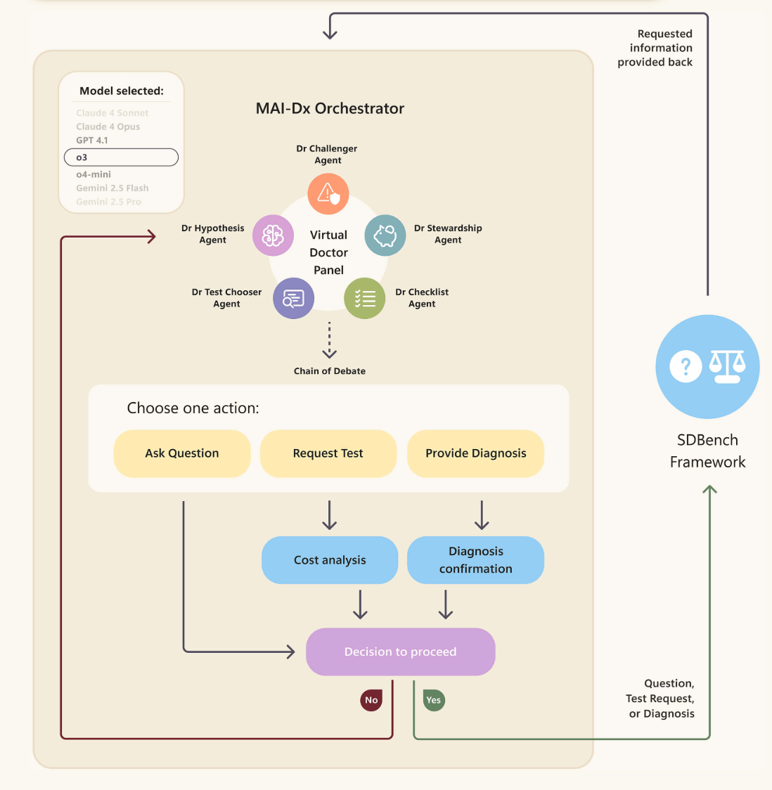 Unlike traditional single-model systems, MAI DxO uses a “chain-of-debate” structure. Each AI agent specializes: